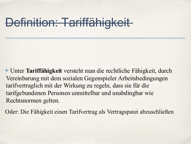 Spitzenorganisationen der Arbeitgeberverbände und Gewerkschaften sind tariffähig, wenn das zu ihren satzungsgemäßen Aufgaben gehört (§ III TVG) oder wenn sie von den Mitgliedsverbänden entsprechend bevollmächtigt sind (§ II TVG). Wörterbuch der deutschen Sprache. Steht nur Gewerkschaften und Arbeitgeberverbände n (einschl. ihrer Spitzenorganisationen) sowie einzelnen Arbeitgeber n zu ( Tarifpartner ). Das Recht, Partei eines Tarifvertrags zu sein, steht auf der Arbeitgeberseite neben den Arbeitgeberverbänden auch den einzelnen Arbeitgebern und den Innungen zu.